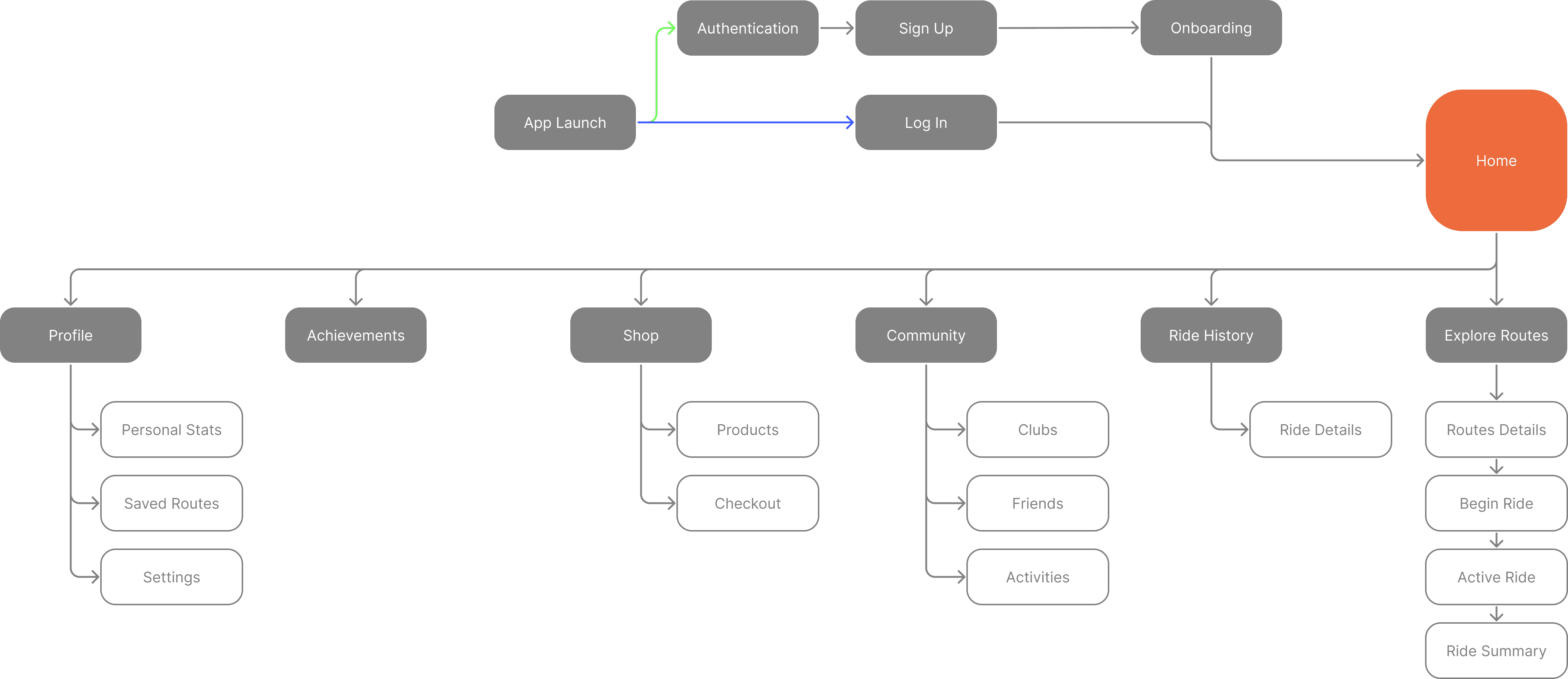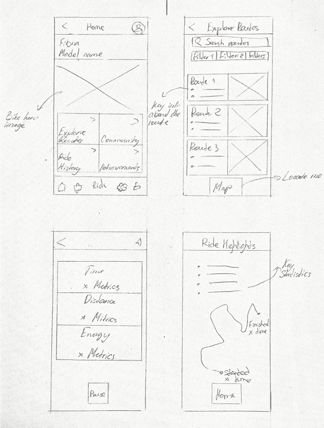 Fibra is designed as a bike companion app that supports the ride before, during, and after it happens. I translated the design principles into a sitemap centered on selecting a route, beginning a ride, and sustaining engagement through history, community, and progress.