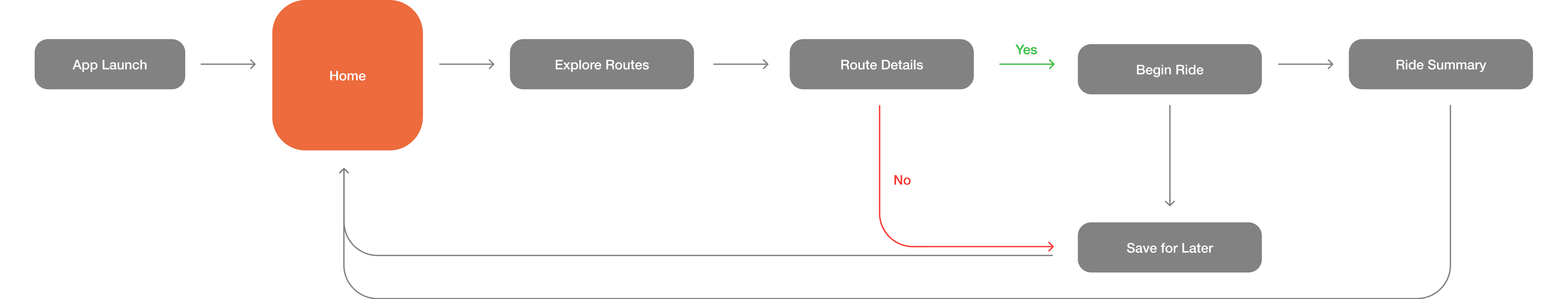 This task flow isolates the decision point between exploring a route and beginning a ride. Because hesitation occurs before the activity starts, I focused on supporting decision-making at the “Route Details” stage.