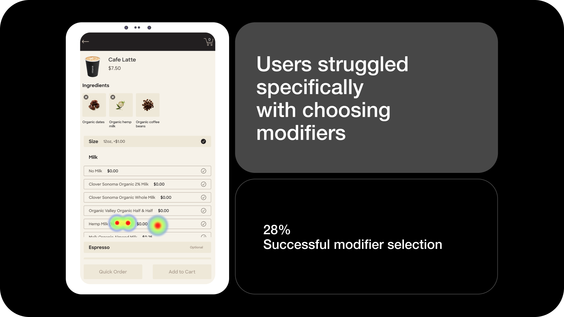 Users added products from the menu using quick add, but could only remove them from cart.