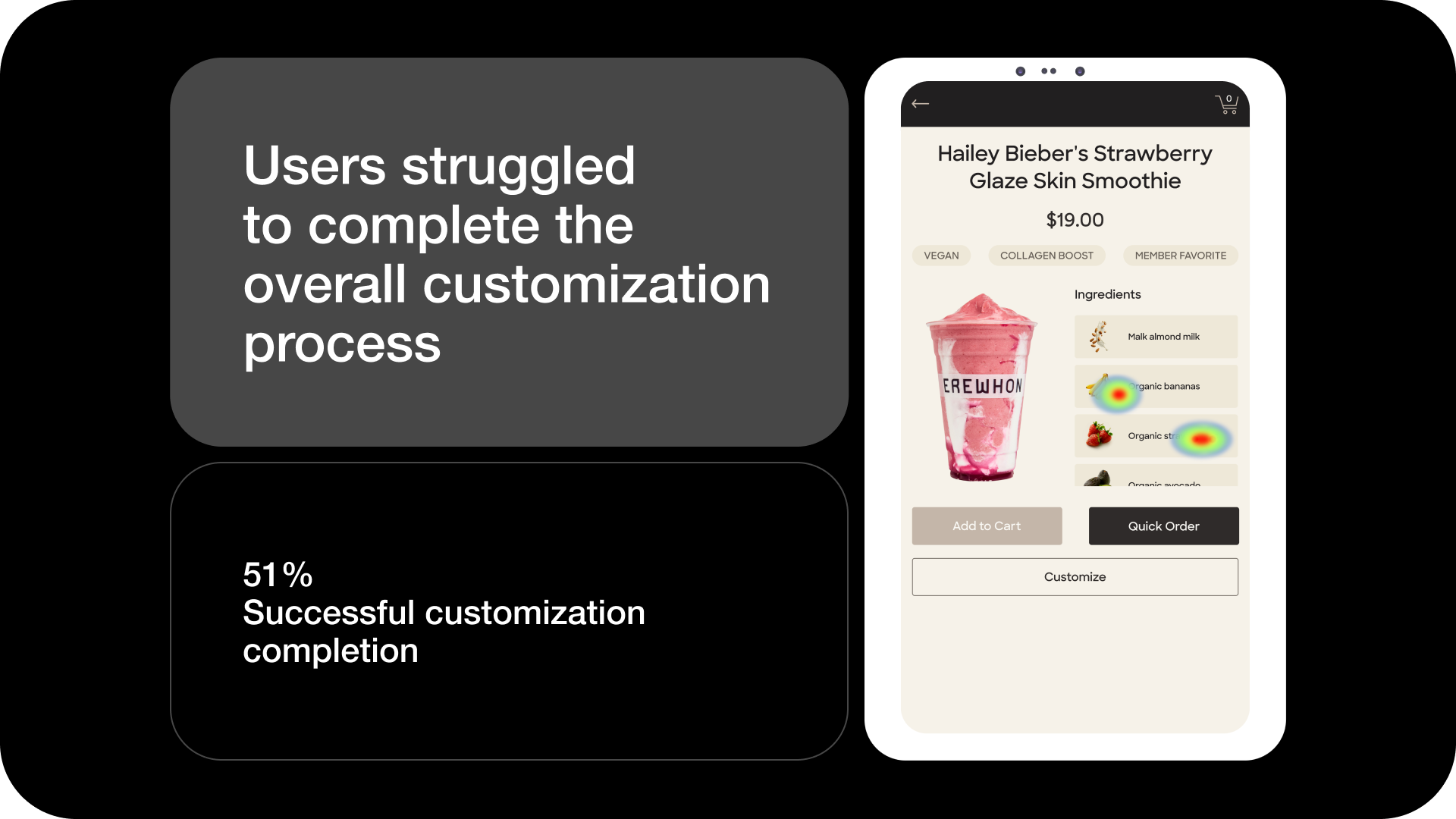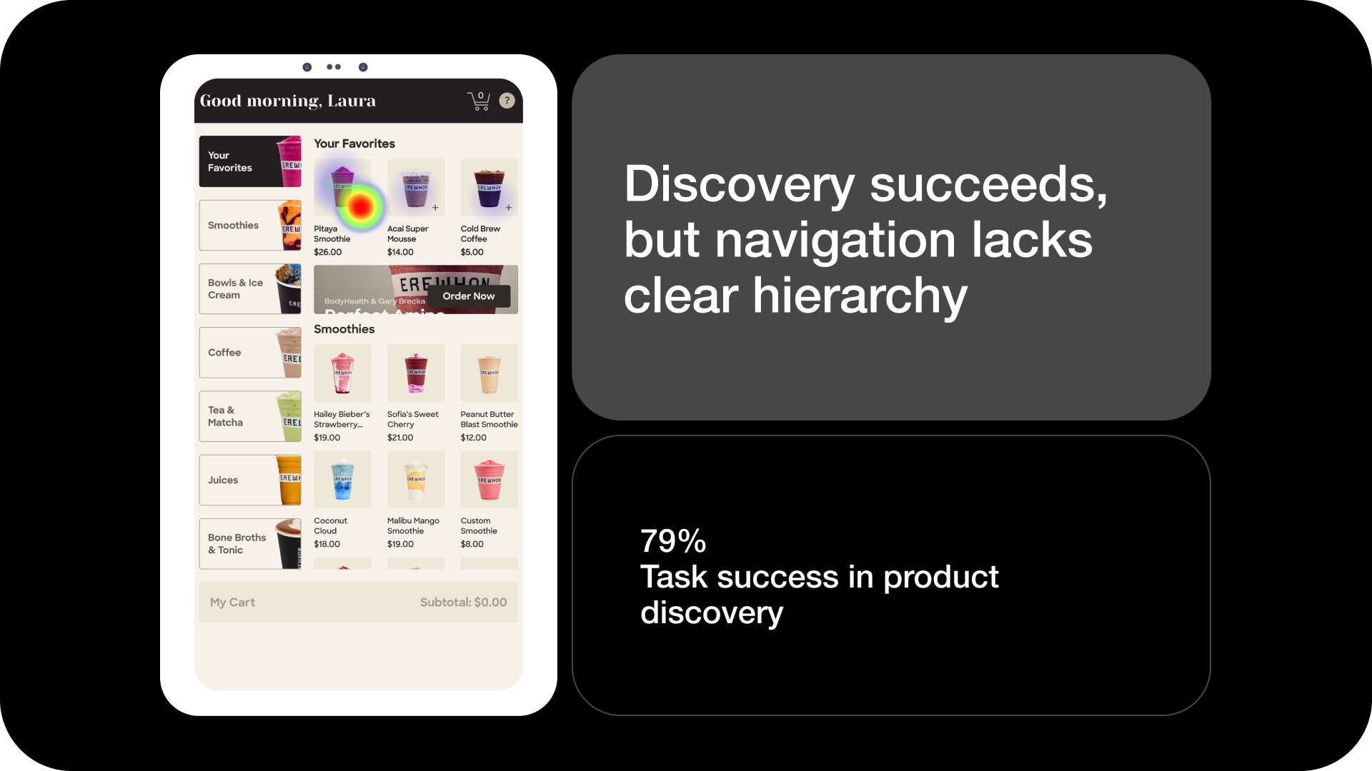Findings, usability insights, and design refinements were presented to Erewhon stakeholders. This work supported early decision-making and provided a validated foundation for subsequent internal iterations and improvements.